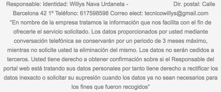 Para solicitar algún servicio promocionado por el Responsable del portal web el usuario deberá aportar en su llamada telefónica, o formulario ciertos datos imprescindibles para llevar a cabo su solicitud. Le informamos que los datos que nos facilita podrán ser cedidos a la empresa Colaboradora, si fuese necesario, para proceder con su solicitud. Sus datos serán tratados dentro de la normativa vigente de Protección de Datos de carácter personal (LOPD). Al dar uso a nuestros servicios usted están aceptando expresamente la comunicación de los mismos, por cualquier medio. Usted tiene derecho a recibir respuesta de cualquier pregunta, consulta o aclaración que le surja derivada de nuestro portal web y servicios.